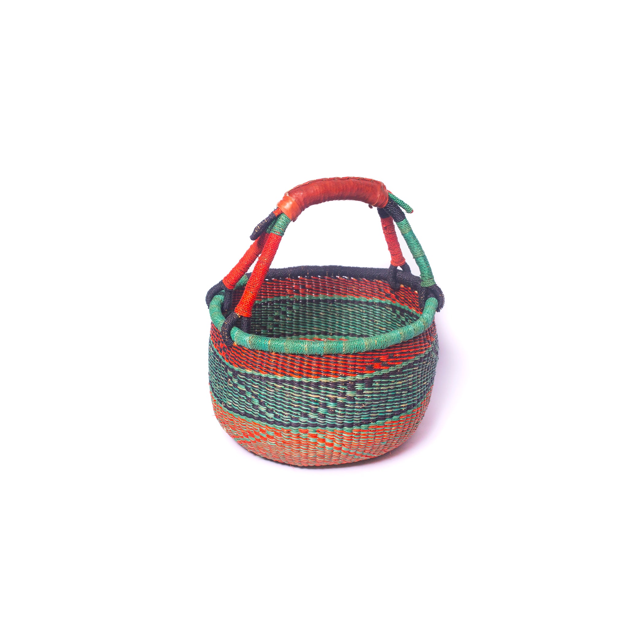 Who needs a bag for life when you can have a basket for life that has been hand woven using a unique design of vibrant patterns and colours. The traditional round Bolga baskets with a single leather handle are named after the town in Northern Ghana in which they like our other baskets are made. They come in a couple of sizes and can either be used as a shopping basket whilst out and about or as a storage vessel in the home for items such as kindling, magazines or fruit.