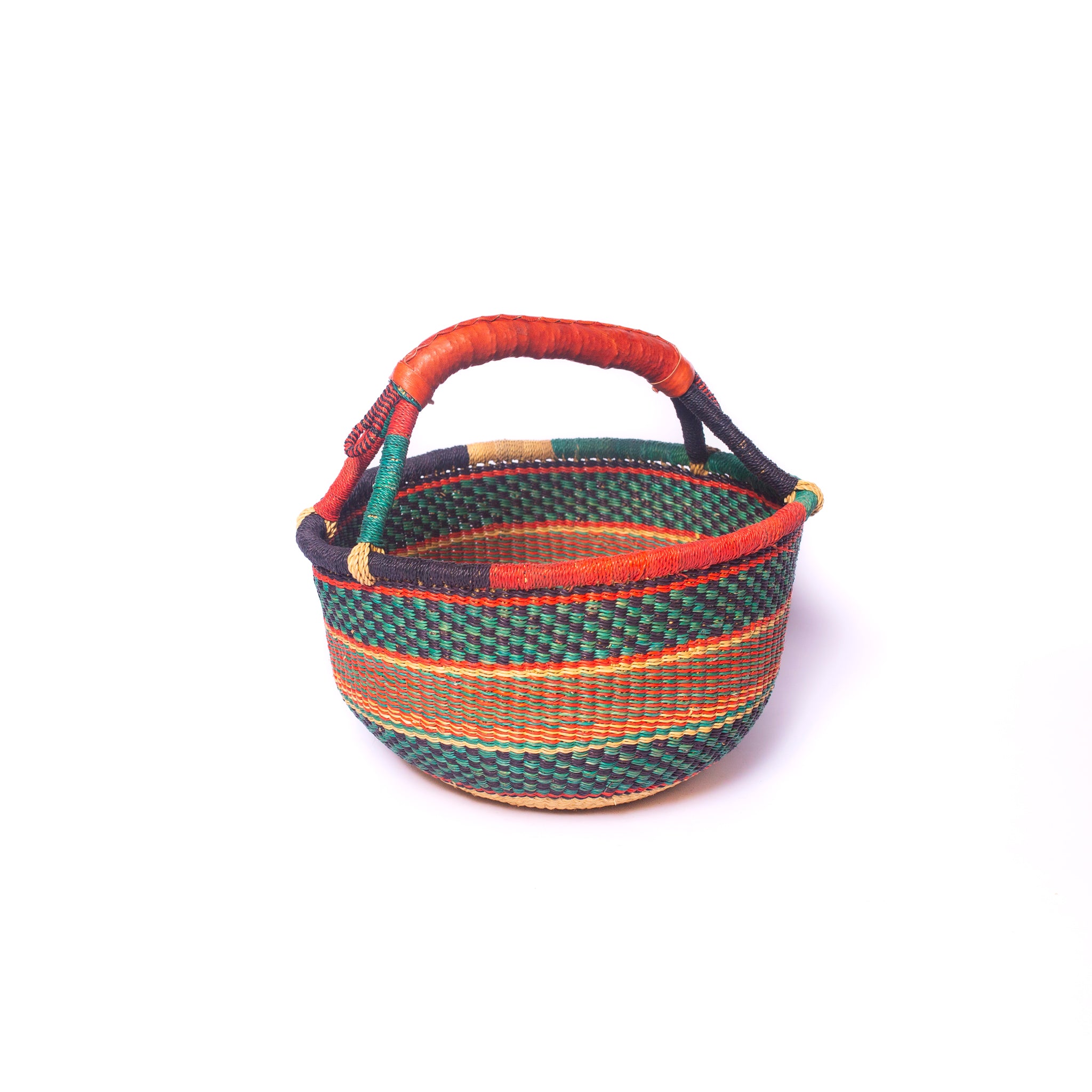 Who needs a bag for life when you can have a basket for life that has been hand woven using a unique design of vibrant patterns and colours. The traditional round Bolga baskets with a single leather handle are named after the town in Northern Ghana in which they like our other baskets are made. They come in a couple of sizes and can either be used as a shopping basket whilst out and about or as a storage vessel in the home for items such as kindling, magazines or fruit.