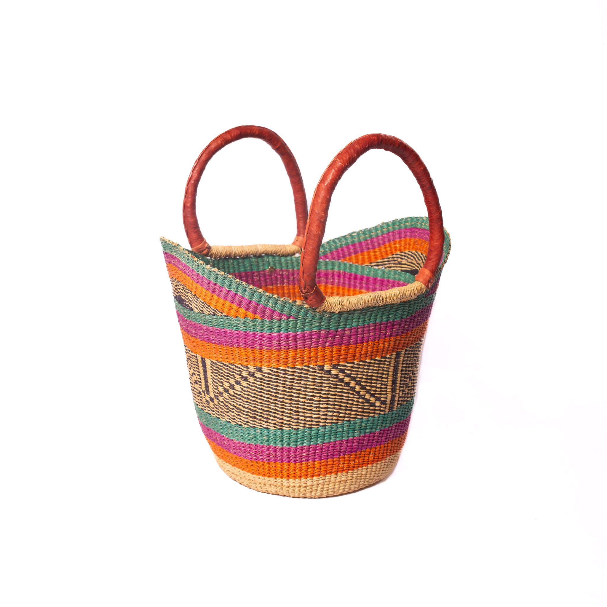 Shop in style with one of our U Shopper shopping baskets. Each one in individually hand woven in a vibrant and unique design, these hand baskets are a durable accessory that will bring a touch of Africa colour to any shopping trip. Woven from elephant grass with lightly wrapped brown leather handles these baskets will have a long life whatever you put in the.