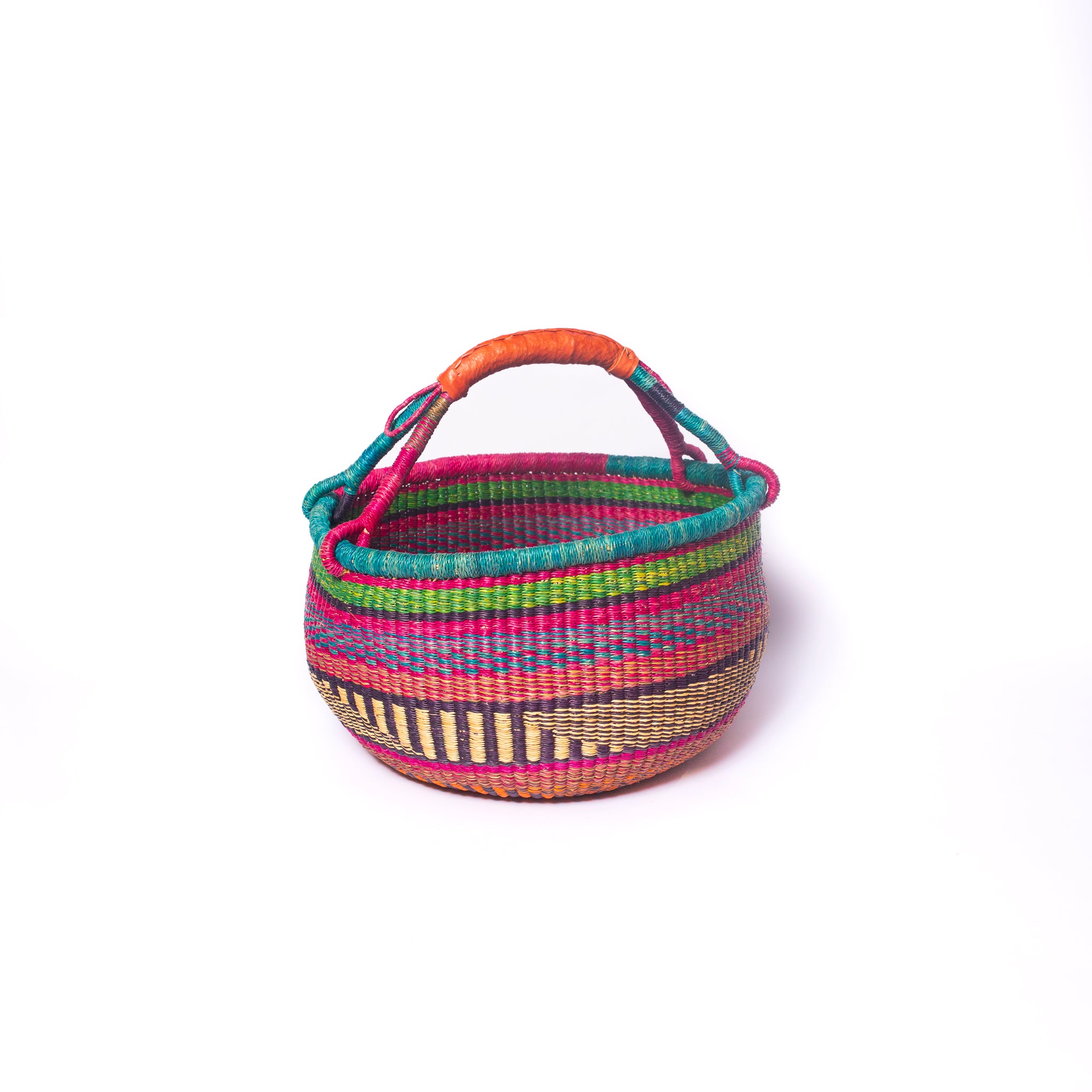 Who needs a bag for life when you can have a basket for life that has been hand woven using a unique design of vibrant patterns and colours. The traditional round Bolga baskets with a single leather handle are named after the town in Northern Ghana in which they like our other baskets are made. They come in a couple of sizes and can either be used as a shopping basket whilst out and about or as a storage vessel in the home for items such as kindling, magazines or fruit.