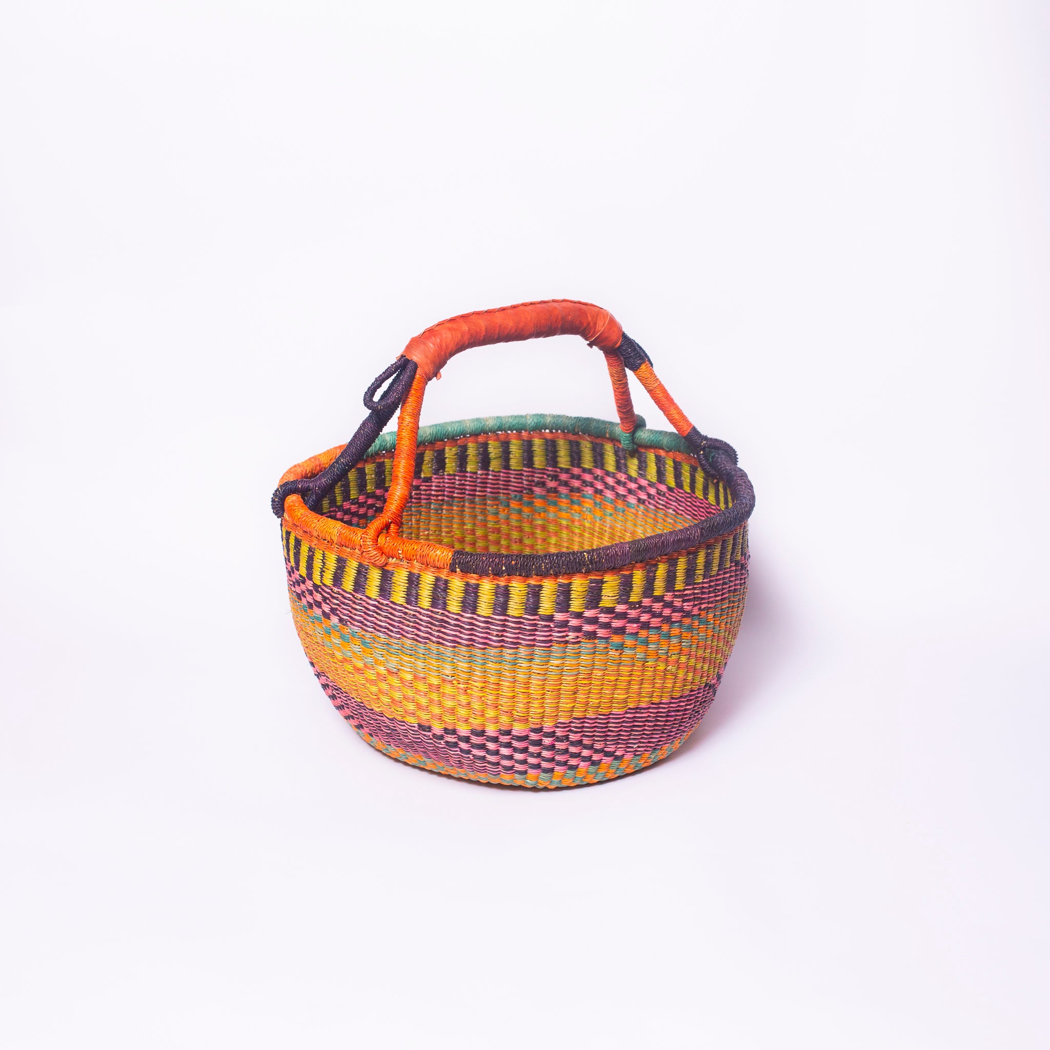 Who needs a bag for life when you can have a basket for life that has been hand woven using a unique design of vibrant patterns and colours. The traditional round Bolga baskets with a single leather handle are named after the town in Northern Ghana in which they like our other baskets are made. They come in a couple of sizes and can either be used as a shopping basket whilst out and about or as a storage vessel in the home for items such as kindling, magazines or fruit.