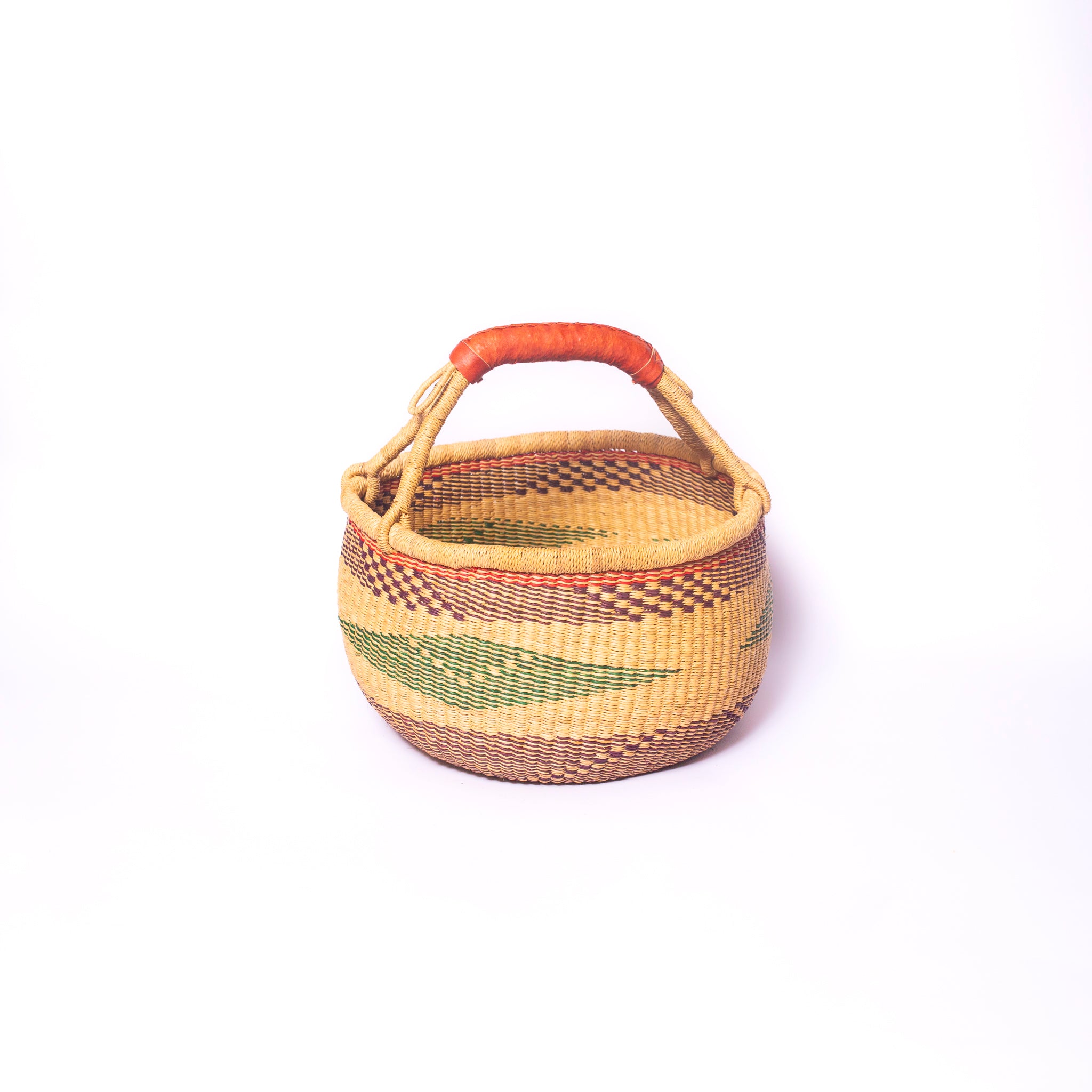 Who needs a bag for life when you can have a basket for life that has been hand woven using a unique design of vibrant patterns and colours. The traditional round Bolga baskets with a single leather handle are named after the town in Northern Ghana in which they like our other baskets are made. They come in a couple of sizes and can either be used as a shopping basket whilst out and about or as a storage vessel in the home for items such as kindling, magazines or fruit.